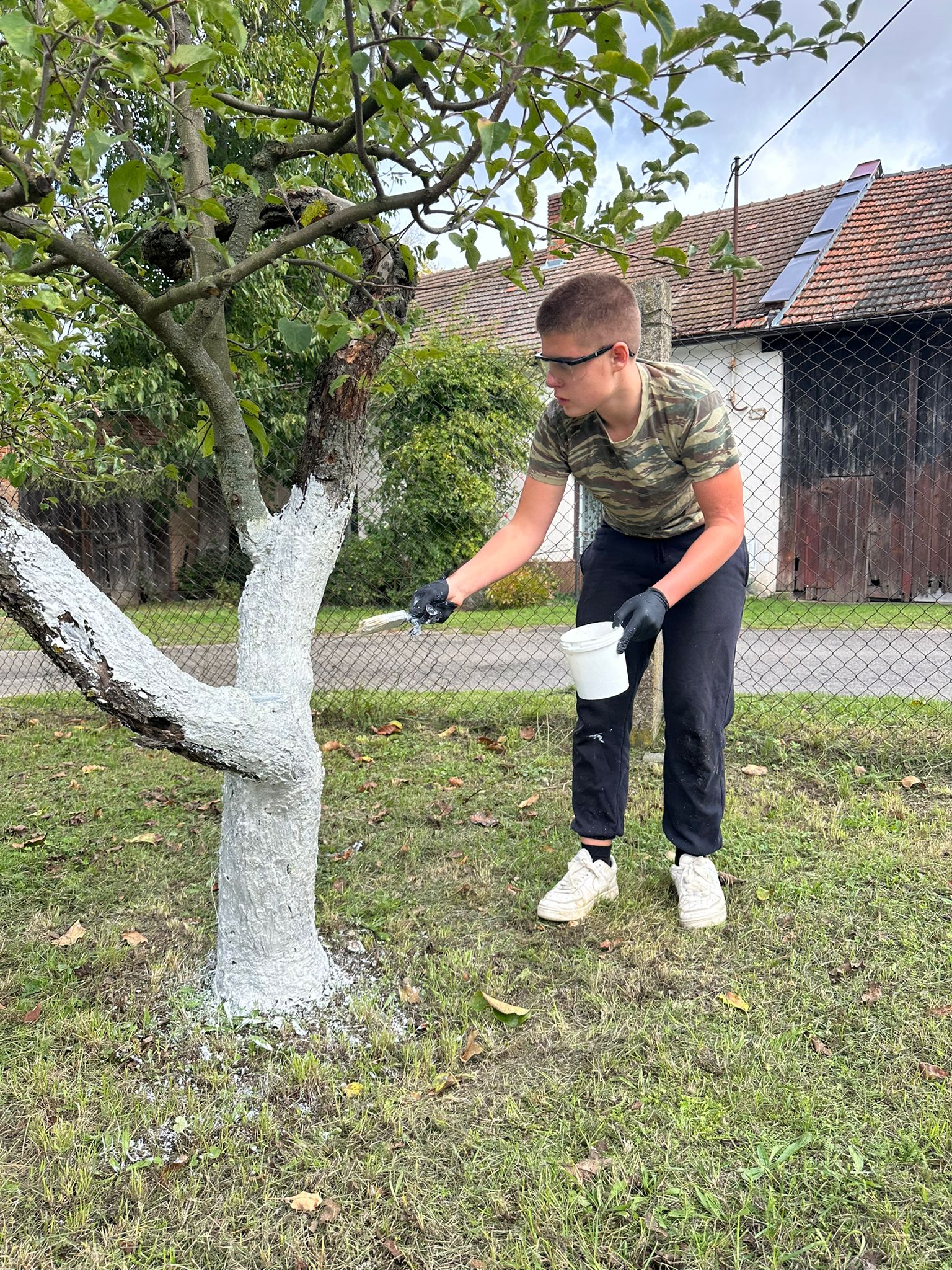 Letos poprvé se žáci 9. ročníku ujali v hodině chemie natírání stromů a šlo jim to moc hezky.