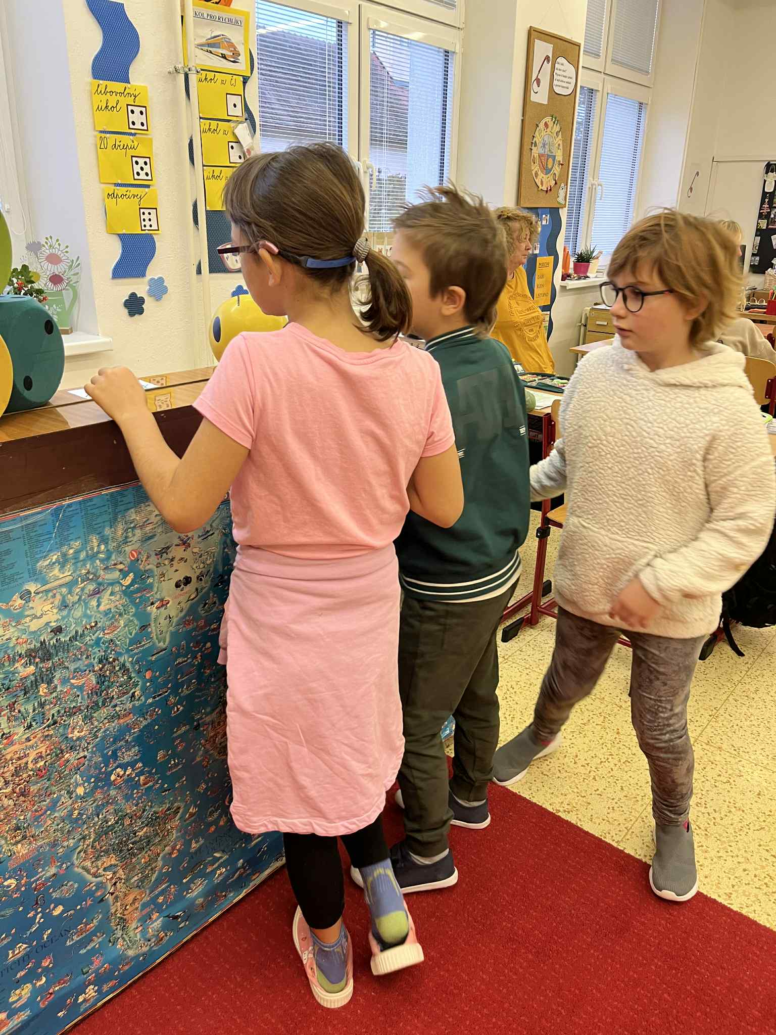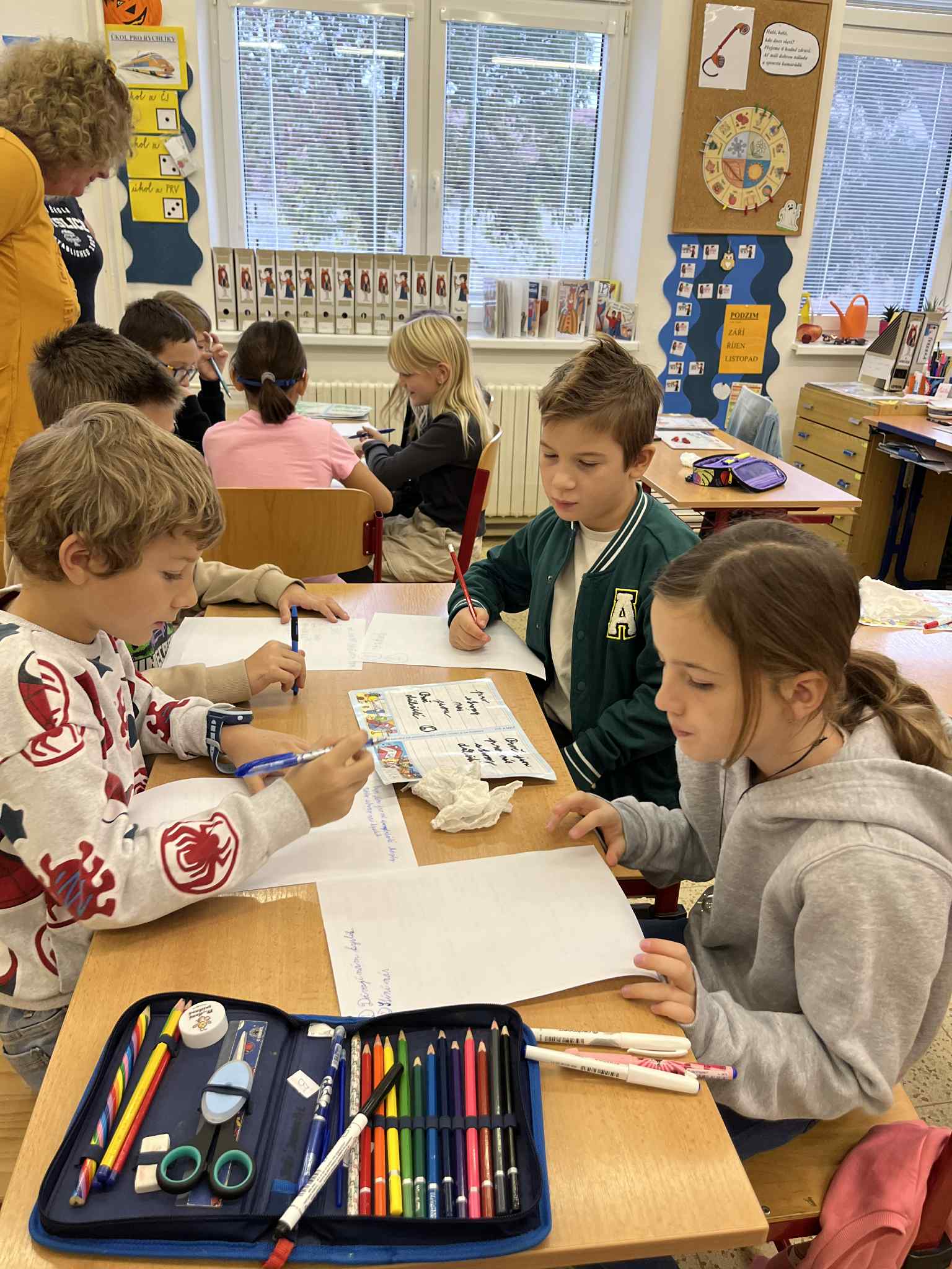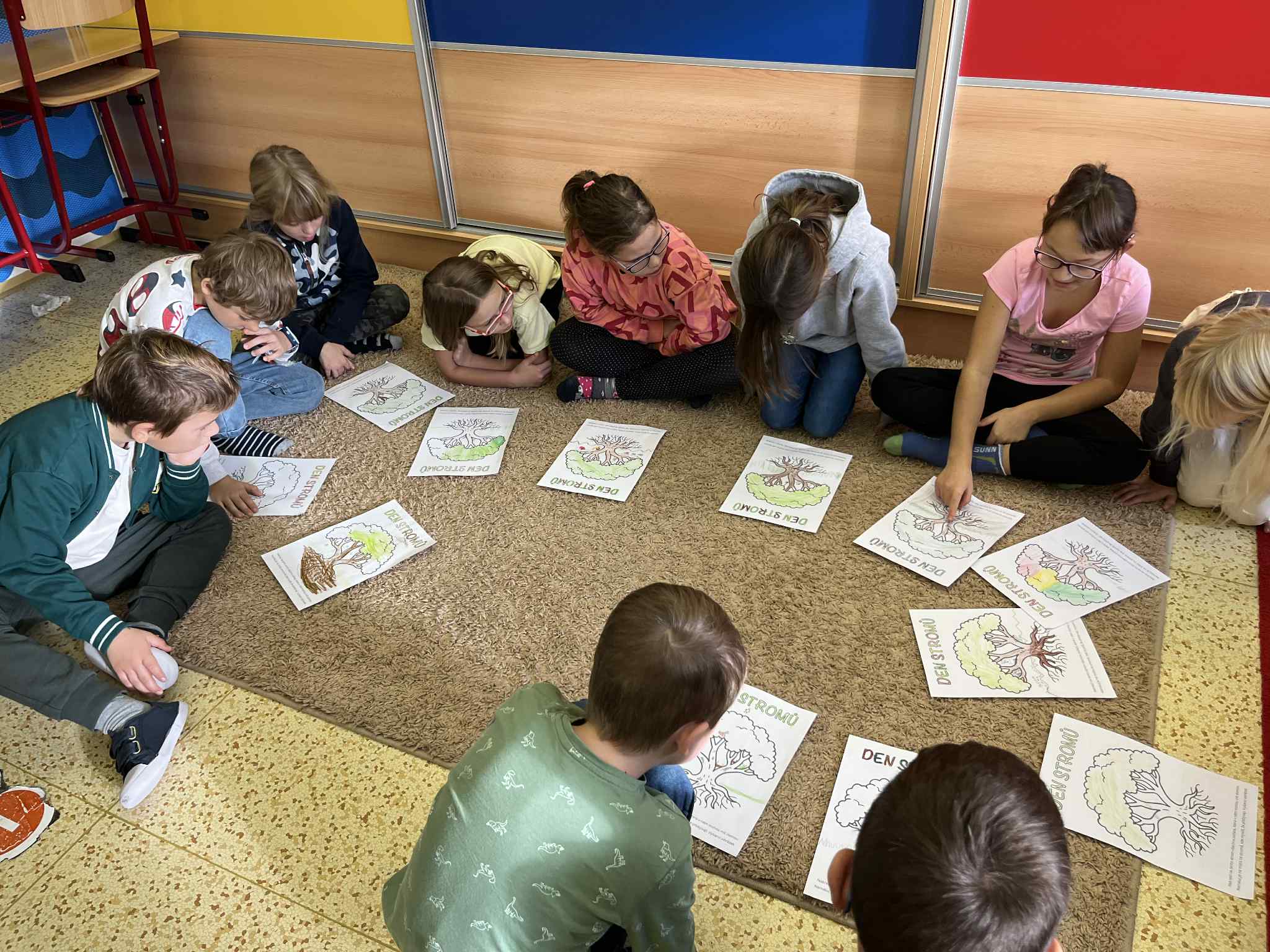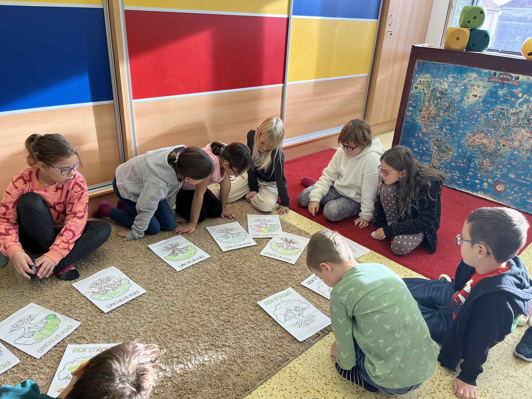 Na začátku hodiny jsme si společně zazpívali písničku „Stromy“ od Jaroslava Uhlíře a Zdeňka Svěráka, která nás příjemně naladila na celé dopoledne. Poté následovala úvodní část – Brainstorming, při kterém děti nejprve pracovaly ve dvojicích a poté ve skupinkách. Společně přemýšlely, proč jsou pro nás stromy důležité a jak nám pomáhají v našem životě i v přírodě.